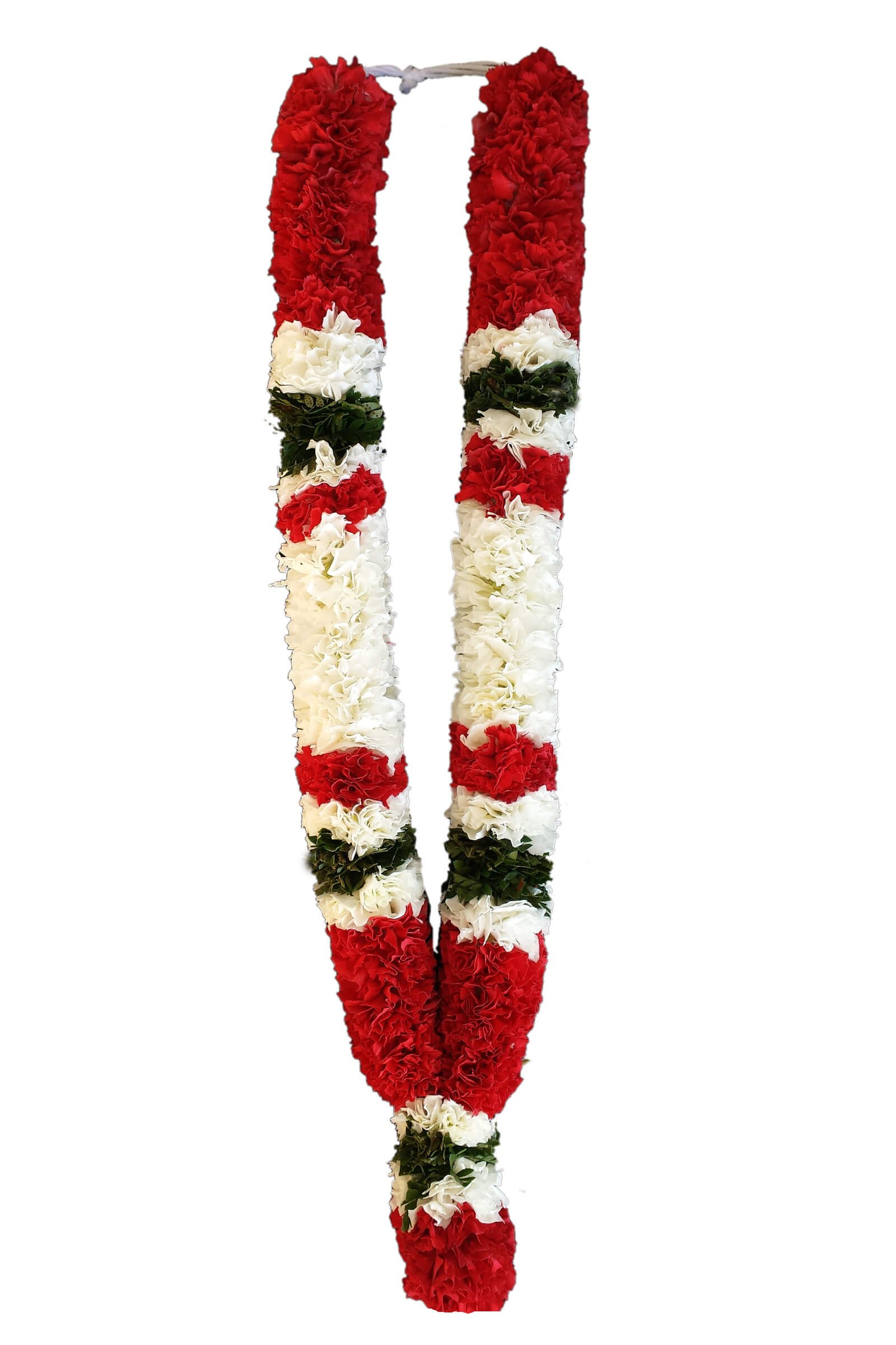 This image showcases a garland made primarily from carnations, designed in a U-shaped loop with a tied cord at the top for hanging or wearing. The garland features a striking pattern: large sections of rich red carnations alternate with bands of white carnations, and several of these white sections are accented with green foliage. The blossoms are densely packed, giving the garland a full, plush appearance. The combination of red, white, and green elements creates a festive and elegant look, suitable for ceremonial, religious, or celebratory occasions.