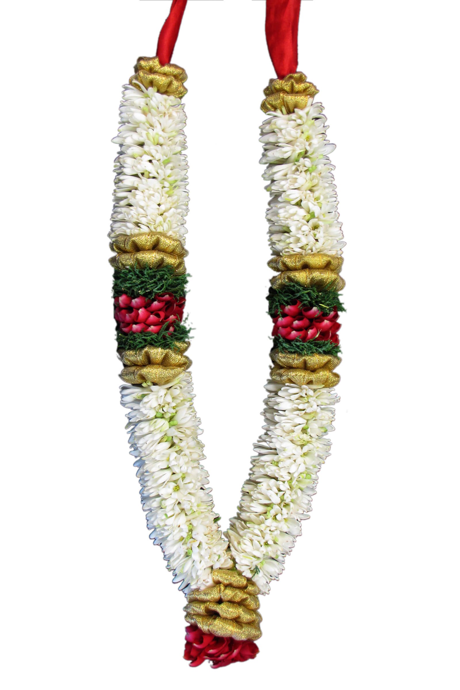 This image depicts an intricately crafted garland featuring fragrant white tuberose blossoms. The garland is looped into a V-shape with a red ribbon at the top for hanging or wearing. The majority of the garland is composed of densely packed tuberose clusters, creating a plush, textural appearance. These white sections are punctuated by decorative bands of gold fabric and small swaths of deep green foliage, which further contain clusters of bright red flowers. The combination of creamy white flowers, shimmering gold ribbon, rich green leaves, and vibrant red accents lends the garland a sophisticated and festive look, making it suitable for ceremonial use or special occasions.