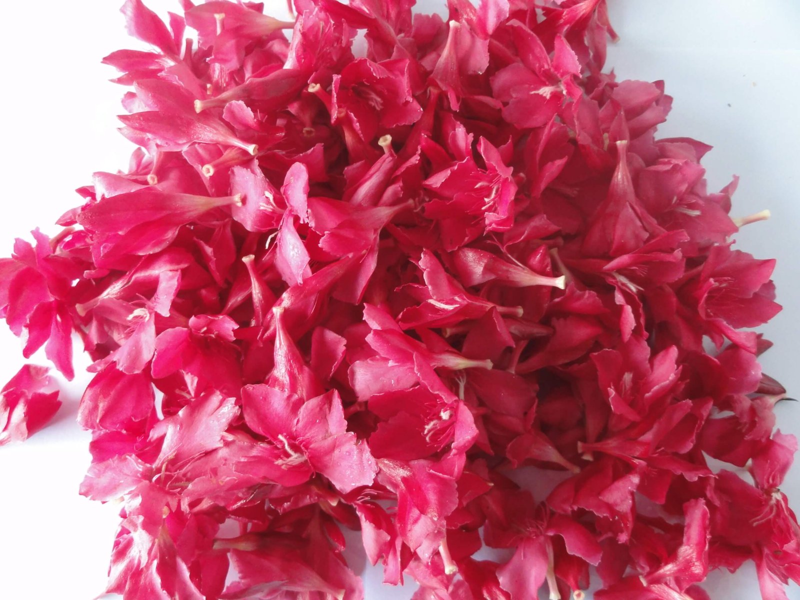 This image shows a loose pile of vivid, deep pink blossoms. The individual flowers have elongated petals that taper to a point, overlapping and curling slightly, giving the pile a textured, layered appearance. Some petals exhibit subtle variations in hue, ranging from bright fuchsia to a richer crimson, with occasional lighter edges and veins. The blossoms appear freshly gathered, as many of the petals are intact and show a gentle sheen. The contrast between the rich color of the flowers and the light background highlights the intensity and delicacy of the petals.