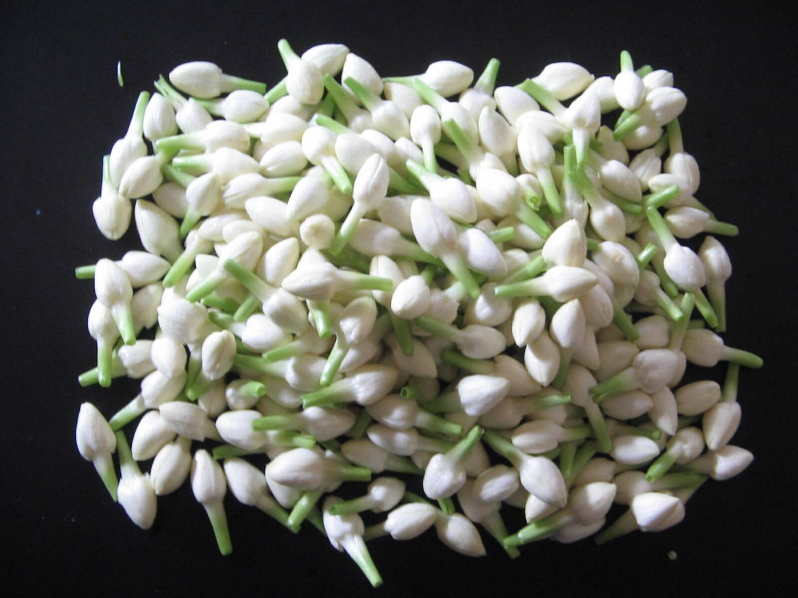 This image displays a pile of small, unopened flower buds, likely jasmine, gathered loosely on a dark surface. Each bud is elongated and tear-drop-shaped, with smooth, white petals tightly wrapped around the developing bloom. The buds are attached to short, slender green stems, providing a contrasting pop of color against the creamy white tips. Arranged in a mound, the buds overlap and interlock, creating a textured, almost woven appearance. The dark background accentuates the delicate buds, emphasizing their freshness and the subtle variations in size and shape.