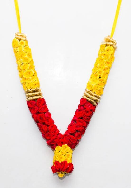 This garland is fashioned from clusters of small, button-like roses arranged in a two-toned design. Suspended from bright yellow ribbons at the top, the garland forms a V-shape. The upper portions of each arm consist of densely packed yellow roses, lending a bright, cheerful appearance. These yellow sections are separated from the lower sections by narrow bands of shimmering gold ribbon. Below the ribbon, the roses transition abruptly to a rich red hue, continuing down to where the two arms meet. At the base, the garland culminates in a rounded cluster of roses featuring both yellow and red blooms, maintaining the two-tone theme. The combination of sunny yellow and deep red roses, accented by gold ribbon, gives this piece a bold and elegant look suitable for festive or ceremonial occasions.