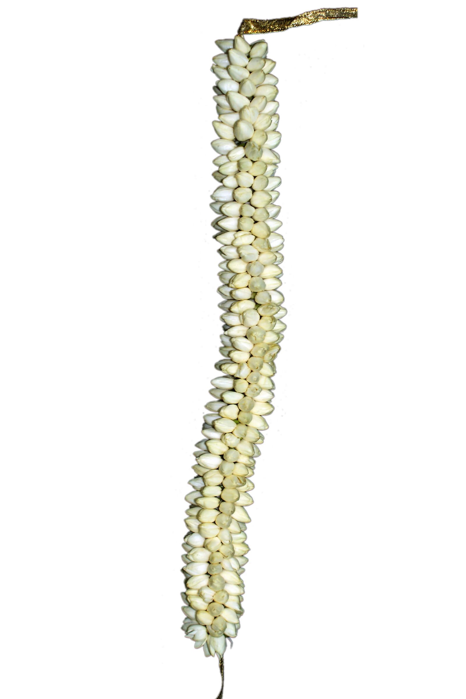 This image displays a traditional hair adornment known as a kondai malai or hair bun garland. The piece consists of numerous small white flower buds—likely jasmine—strung closely together along a cord to create a continuous, cylindrical shape. Each bud is aligned in neat rows, giving the garland a dense, textured appearance. At one end, a narrow, shimmering gold ribbon is attached for securing the garland to the hair. The uniform arrangement of the buds allows the garland to be wrapped around a bun or plait, creating a fragrant, elegant accent typically worn during festive occasions or ceremonies.