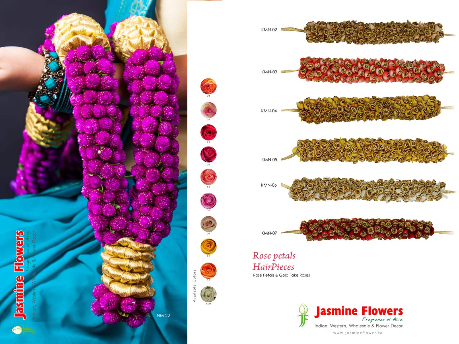 The page shows a bright fuchsia hair bun garland trimmed with gold ribbon, displayed on a model. To the right are several slim hairpieces made from rose petals and gold-toned roses, arranged in different color patterns. A small palette lists available colors, indicating customization options.