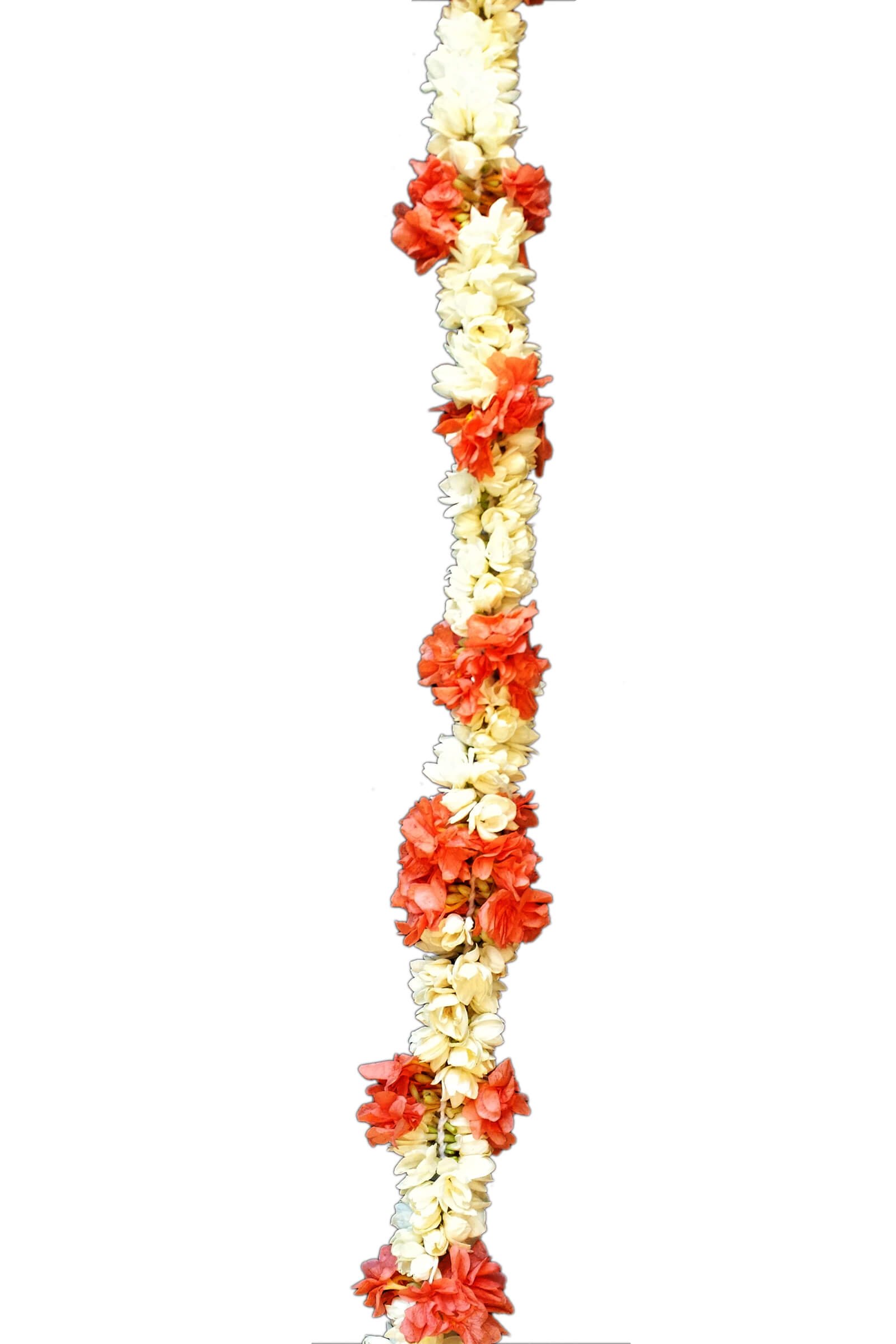 This lovely flower string features a beautiful combination of creamy white jasmine buds and bright orange marigold-style clusters arranged in alternating sections. The soft elegance of jasmine pairs perfectly with the bold, festive charm of the orange blossoms, creating a visually striking contrast. Ideal for weddings, religious rituals, and cultural events, this string brings together fragrance, tradition, and celebration in a graceful and eye-catching design.